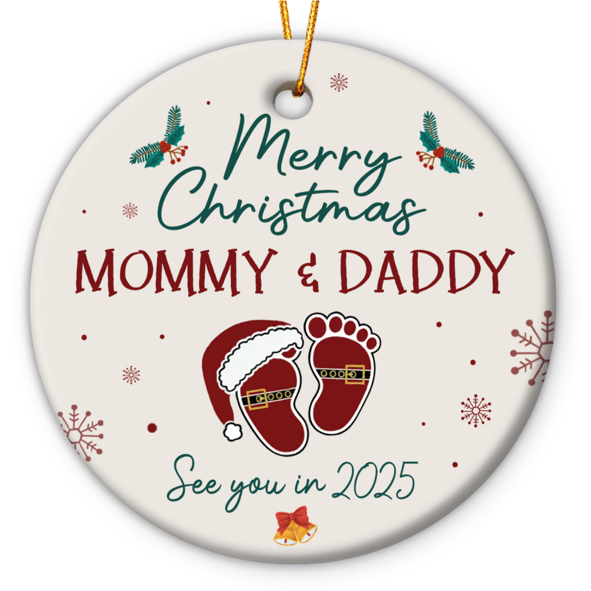 Personalized Pregnancy Announcement New Baby Ornament, Merry Christmas Mommy And Daddy See You In 2025, First Christmas Ornament