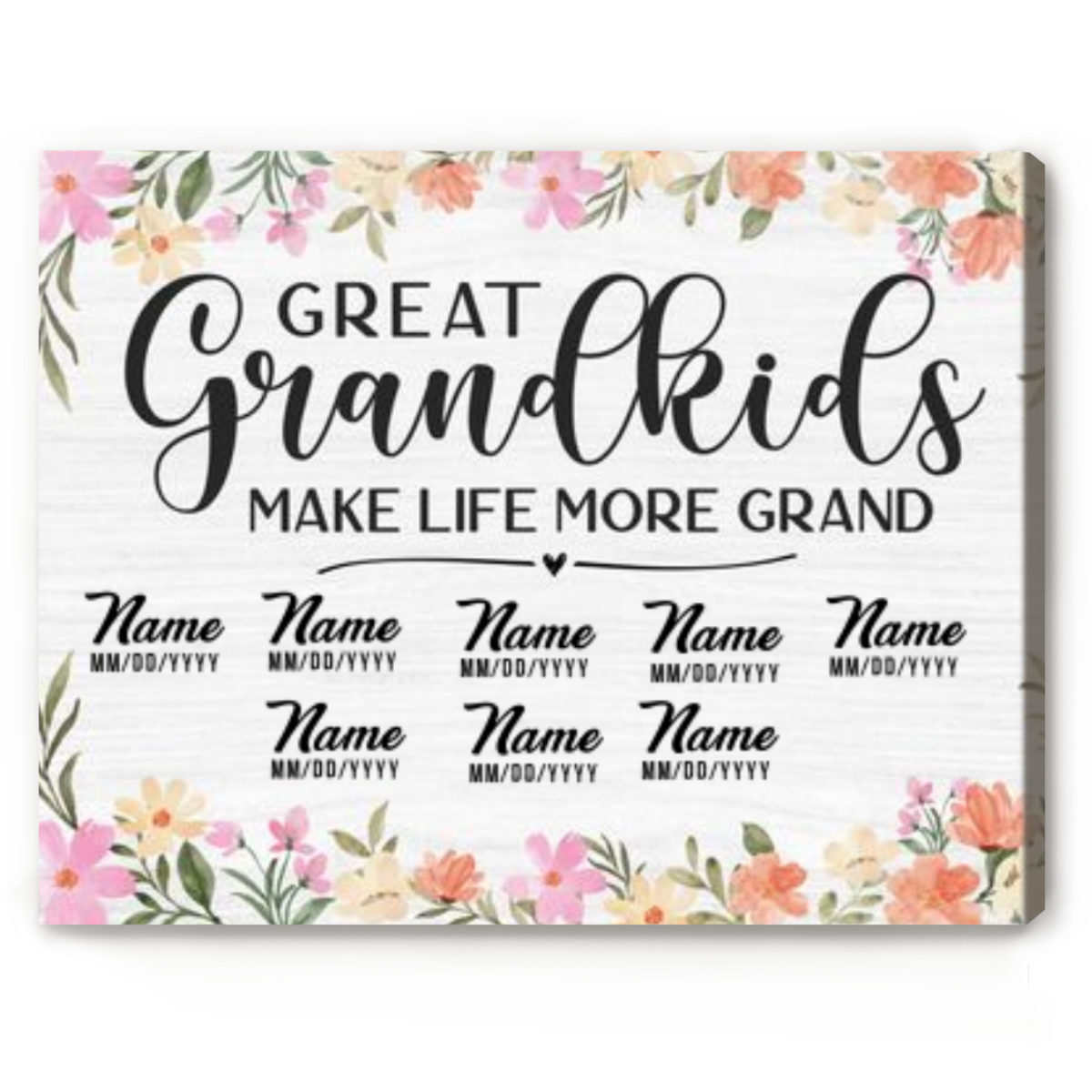 Mother’s Day Gifts For Grandma – Great Grandkids Make Life More Grand – Grandchildren Names And Birthdays Canvas – Custom Sign For Grandparents
