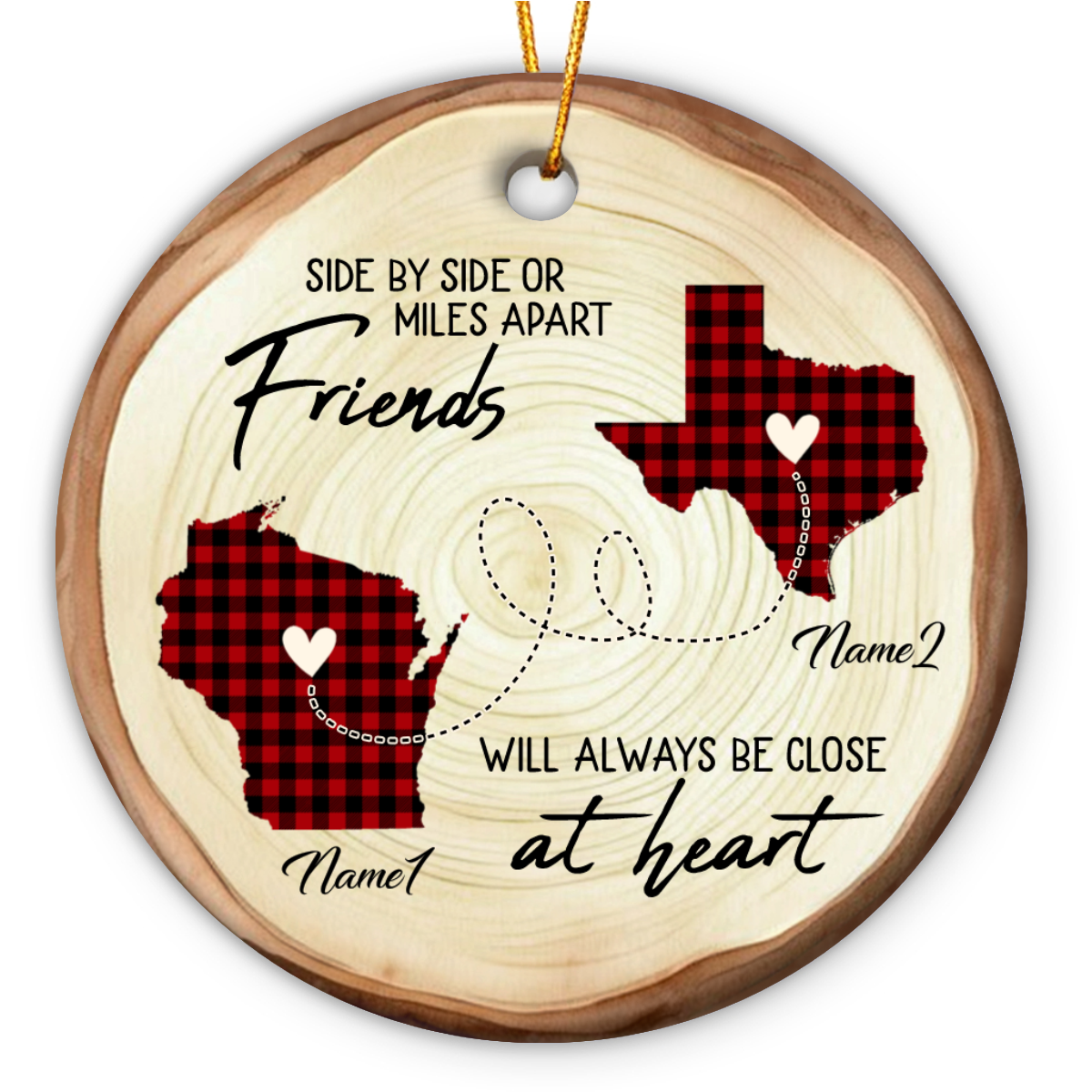 Personalized Two State Long Distance Friendship Ornament, Side By Side Or Miles Apart Friends Ceramic Ornament