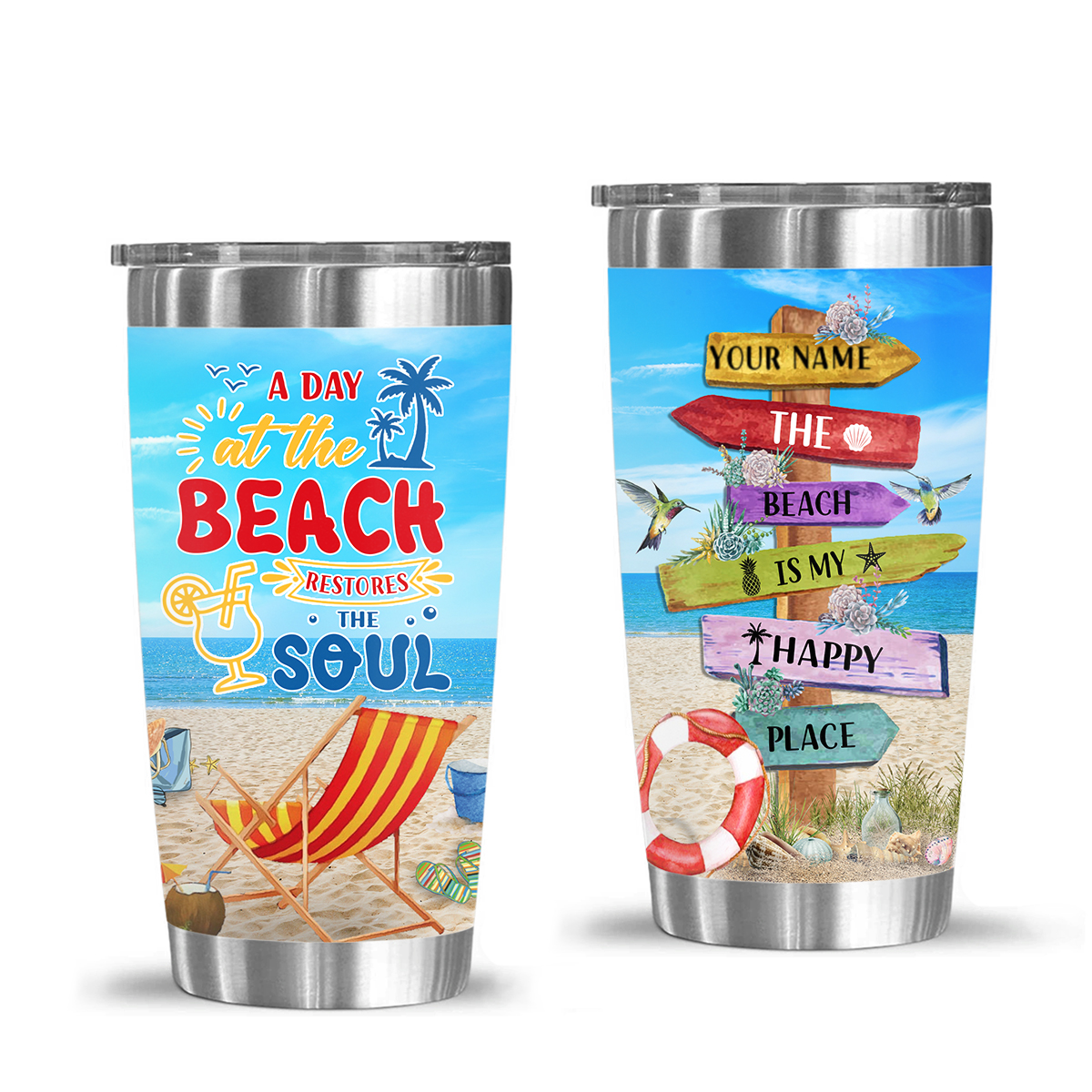 A Day At The Beach Restores The Soul Tumbler Custom, Beach Lover Gifts With Names, Beach Tumbler For Women